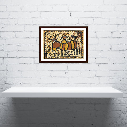 Regular price Rs. 1,399.00Regular priceUnit price / perSale price Rs. 1,399.00Inspired by the Sohrai harvest festival, this hand-painted tribal artwork portrays two elephants in earthy ochre, rust, and black hues. Created on paper using natural pigments, it celebrates prosperity, fertility, and community spirit—perfect for ethnic or contemporary interiors.