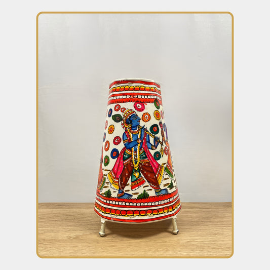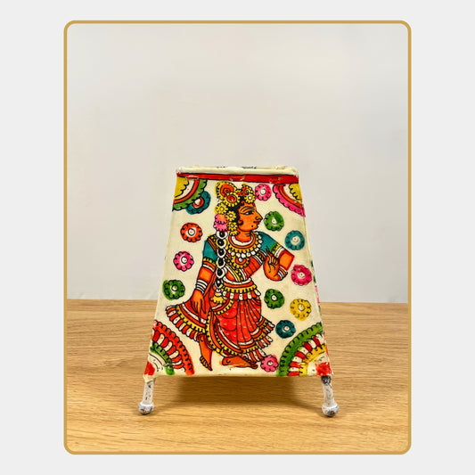Regular price Rs. 1,115.00Regular priceUnit price / perSale price Rs. 1,115.00Celebrate divine love with this Tholu Bommalata lamp showcasing Radha and Krishna in a joyous dance. Intricately hand-painted in vibrant reds, blues, and greens, this lamp captures movement, rhythm, and the spirit of Indian folklore. Crafted on leather and supported by a sturdy mini metal frame, it’s a charming decor piece for side tables and gift occasions.