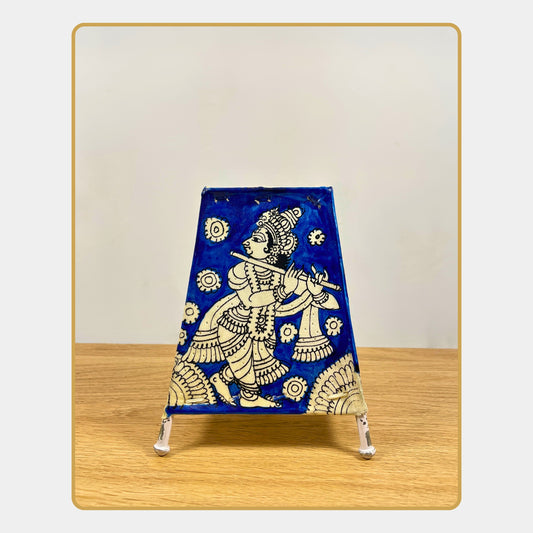 Regular price Rs. 1,115.00Regular priceUnit price / perSale price Rs. 1,115.00Understated yet striking, this Tholu Bommalata lamp presents Radha and Krishna in delicate line art against a deep blue background. The monochrome floral patterns add contrast and mystique. A great choice for lovers of minimal folk aesthetics with rich storytelling.