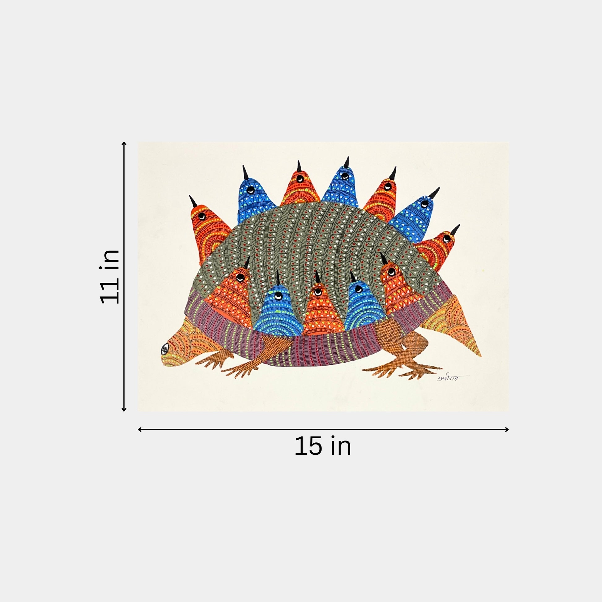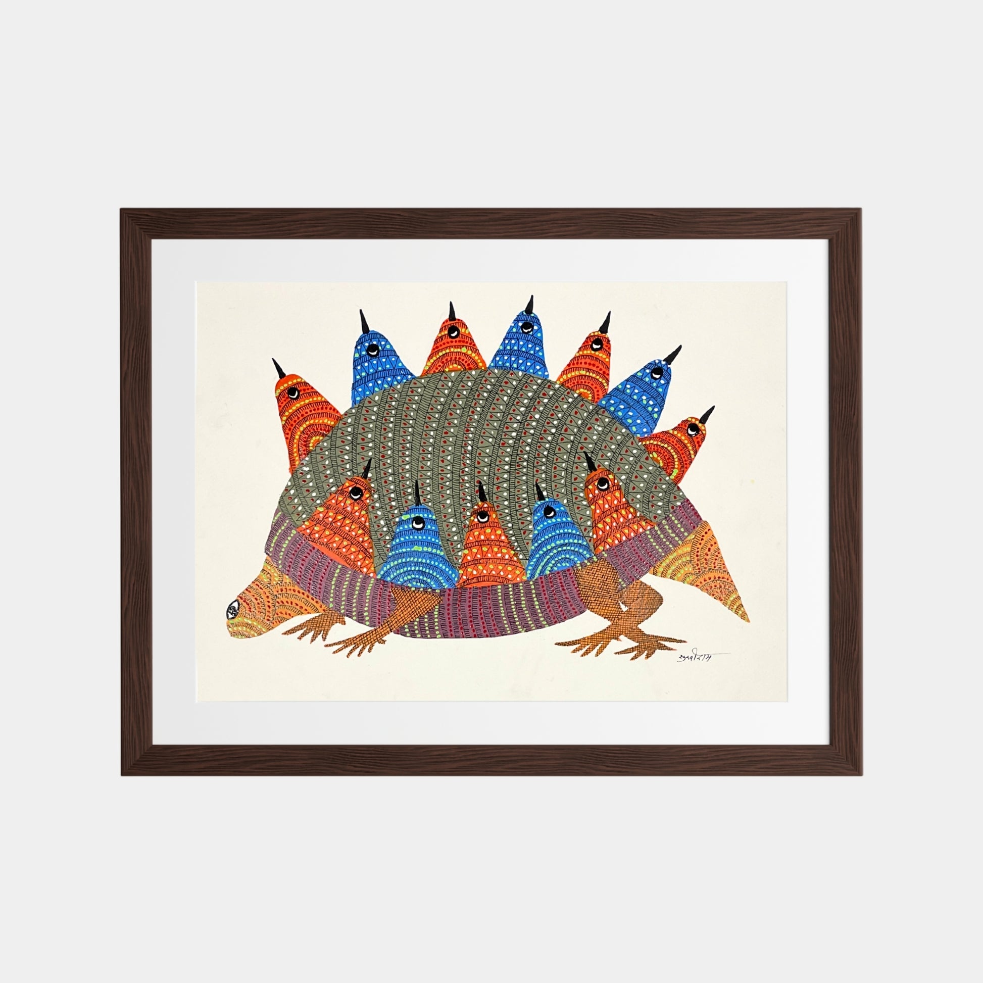This striking Gond painting beautifully blends the essence of protection and coexistence in nature. A tortoise, adorned with intricate patterns, carries a vibrant array of birds on its shell, symbolizing the harmonious relationship between land and sky. The birds, painted in radiant hues of red, blue, and orange, stand tall like protective spires, signifying unity, balance, and mutual dependence. Through detailed linework and rich symbolism, this artwork captures the essence of traditional folklore, where animals and nature exist as one, weaving a timeless tale of survival, support, and sacred kinship.