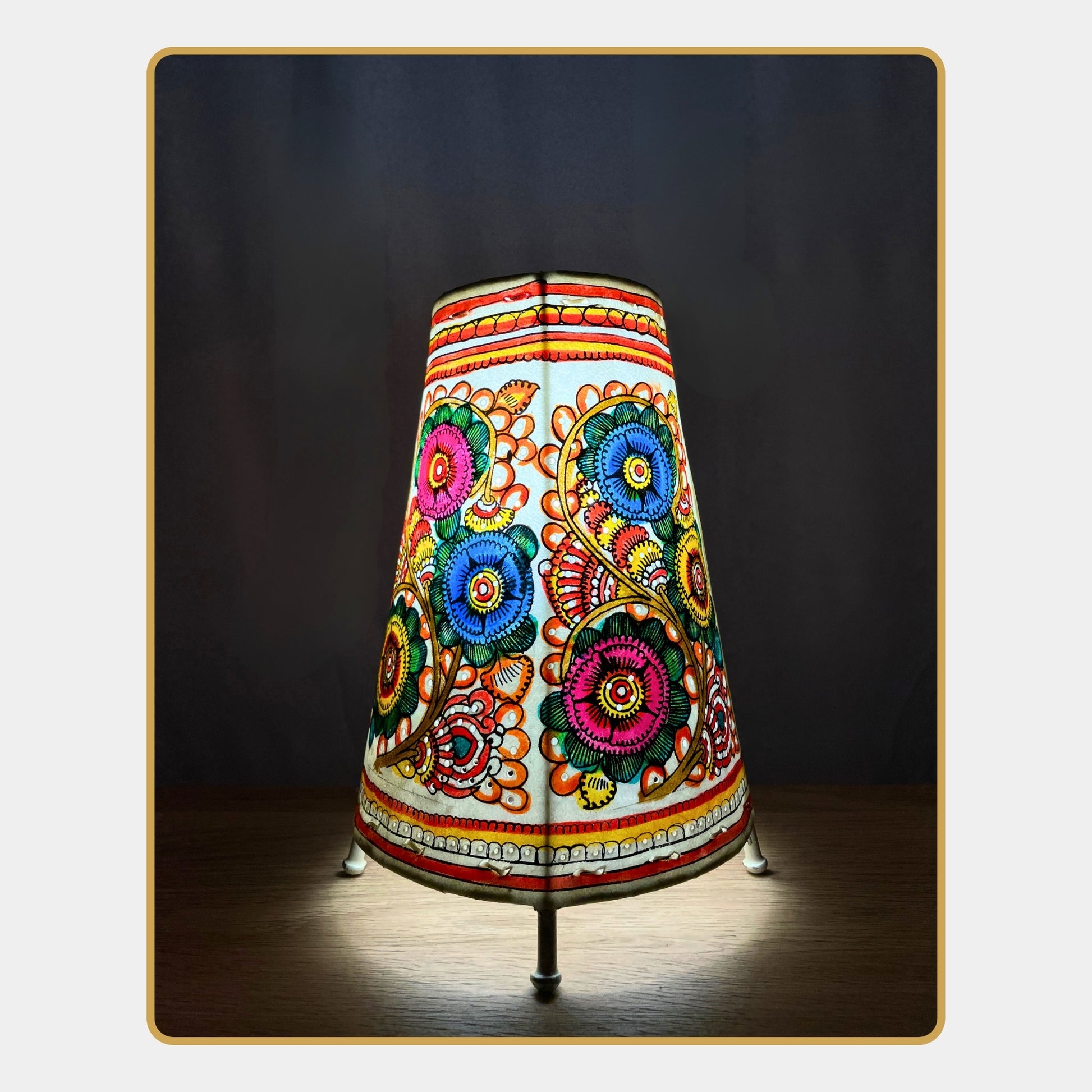 Inspired by the traditional leather puppetry of Andhra Pradesh, these lamps reinterpret the intricate designs of Tholu Bommalata — once used in shadow puppetry storytelling — into vibrant, hand-painted leather artworks that radiate culture and craftsmanship.