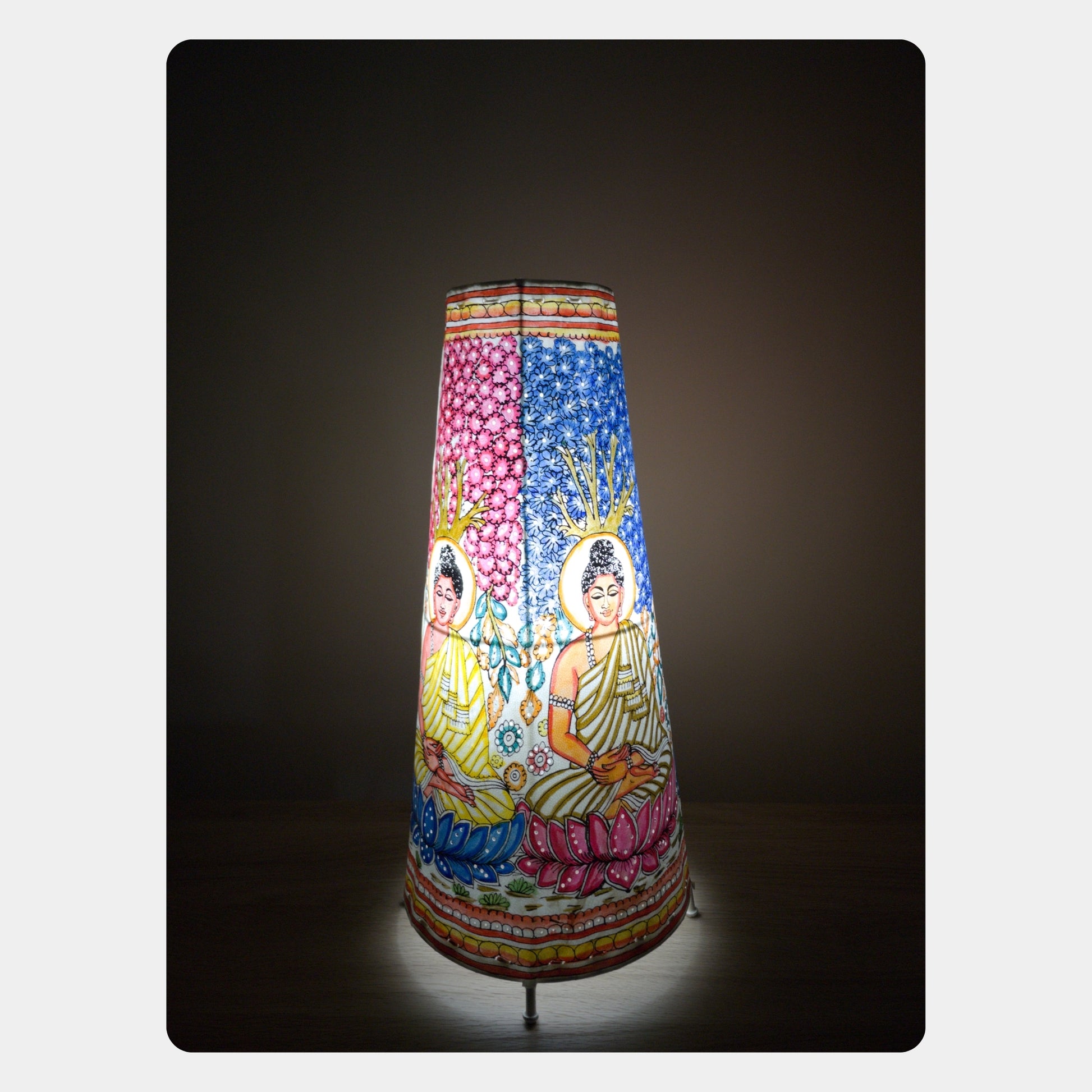Immerse your space in serenity with this handcrafted Tholu Bommalata Lamp depicting Lord Buddha in deep meditation beneath the Bodhi tree. Inspired by traditional Andhra shadow puppetry, the artwork captures the moment of enlightenment, surrounded by vibrant lotus motifs and sacred symbolism. The cone-shaped design and intricate hand-painted detailing make it a spiritual centerpiece, radiating peace and calm. Perfect for meditation rooms, mindful corners, or as a thoughtful gift rooted in Indian folk art.
