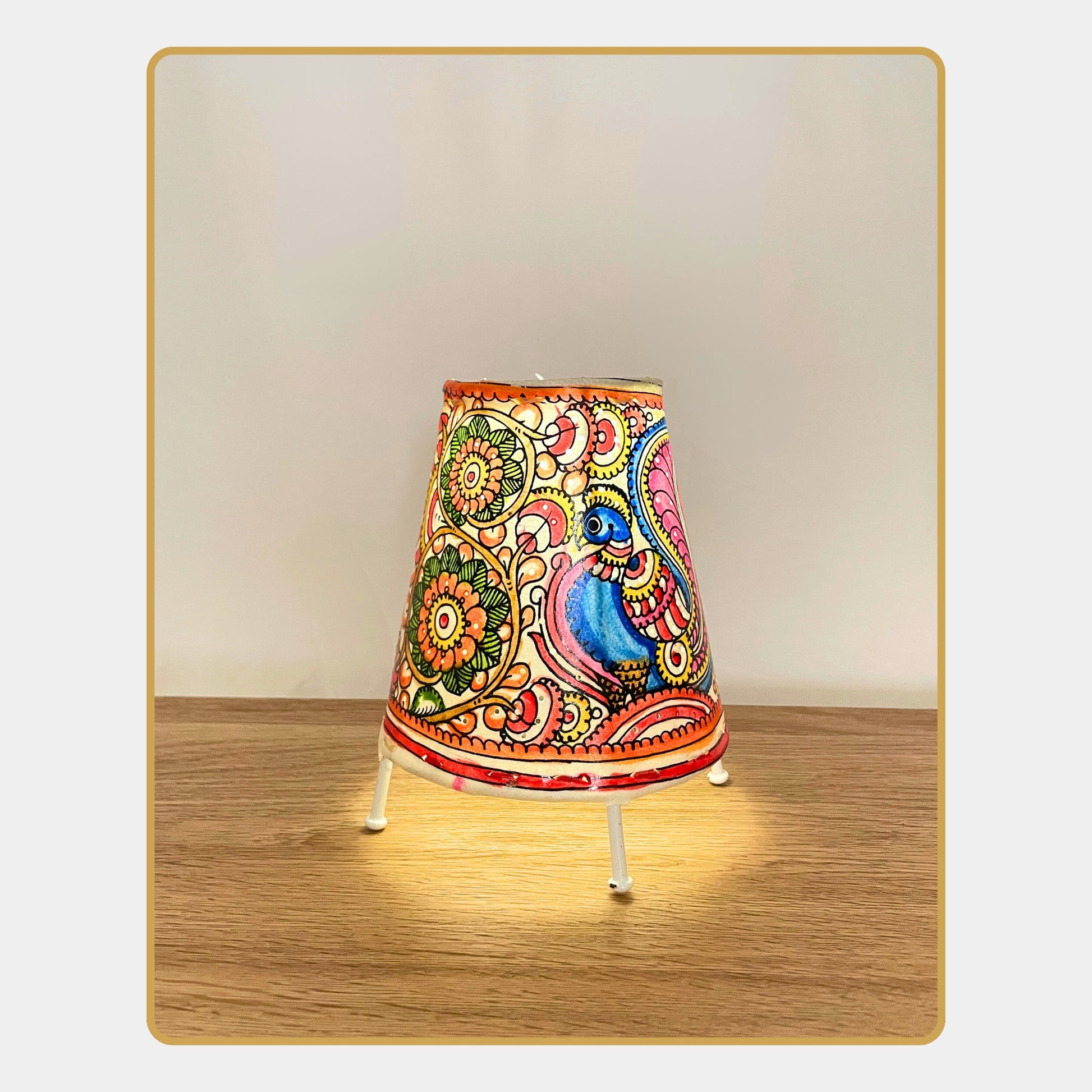 Embodying grace and beauty, this handcrafted lamp adorned with beautiful Peacocks & Flowers. A classic Tholu Bommalata creation, this lamp adds a regal, nature-inspired aesthetic to your home.