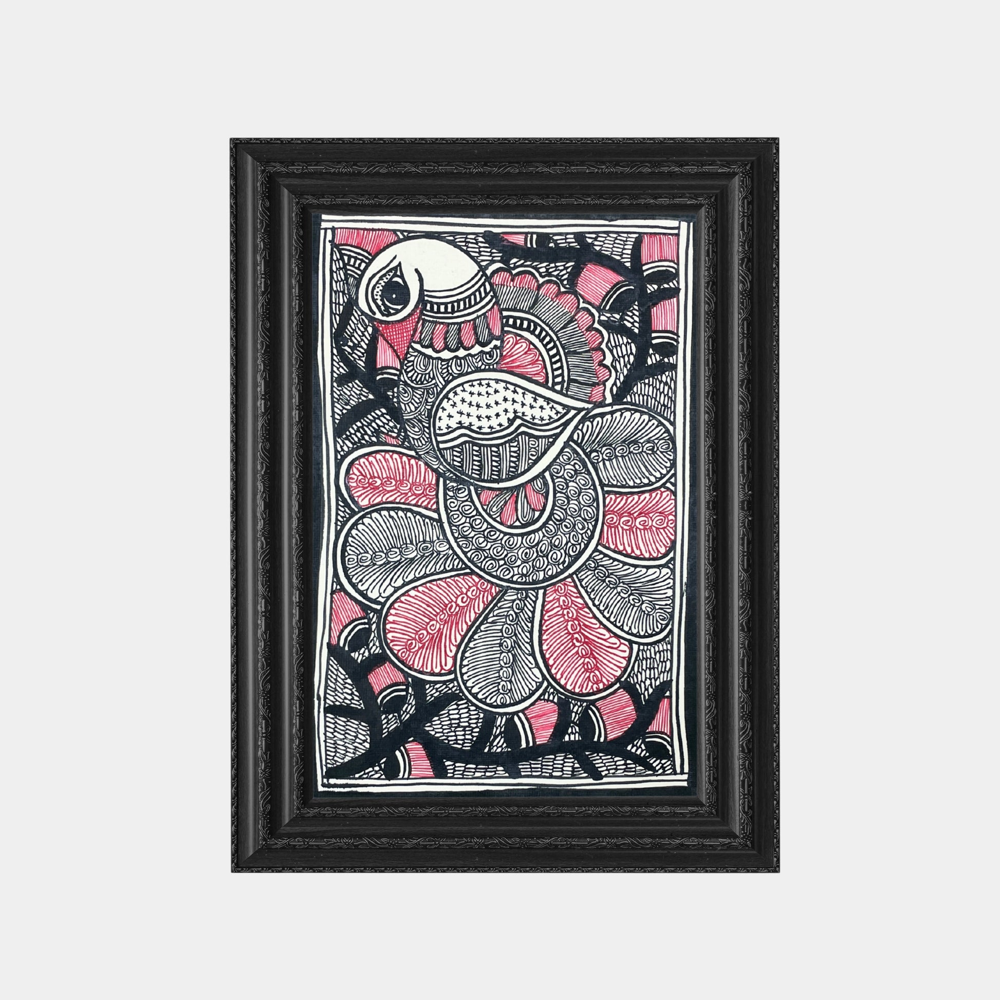 Originating from the Mithila region of India, this artwork showcases the rich heritage of Indian folk art, known for its fine detailing and symbolic themes. Perfect for home décor, gifting, or art enthusiasts, this framed piece adds cultural charm and timeless beauty to any setting.