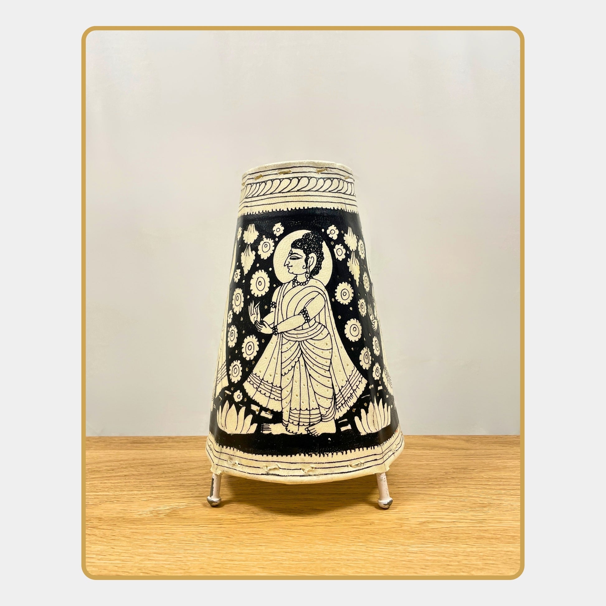 This elegant black-and-white Tholu Bommalata lamp features a tranquil image of Lord Buddha surrounded by floral mandalas. A symbol of peace, mindfulness, and calm, this hand-painted leather lamp brings a meditative ambiance to any corner of your home.