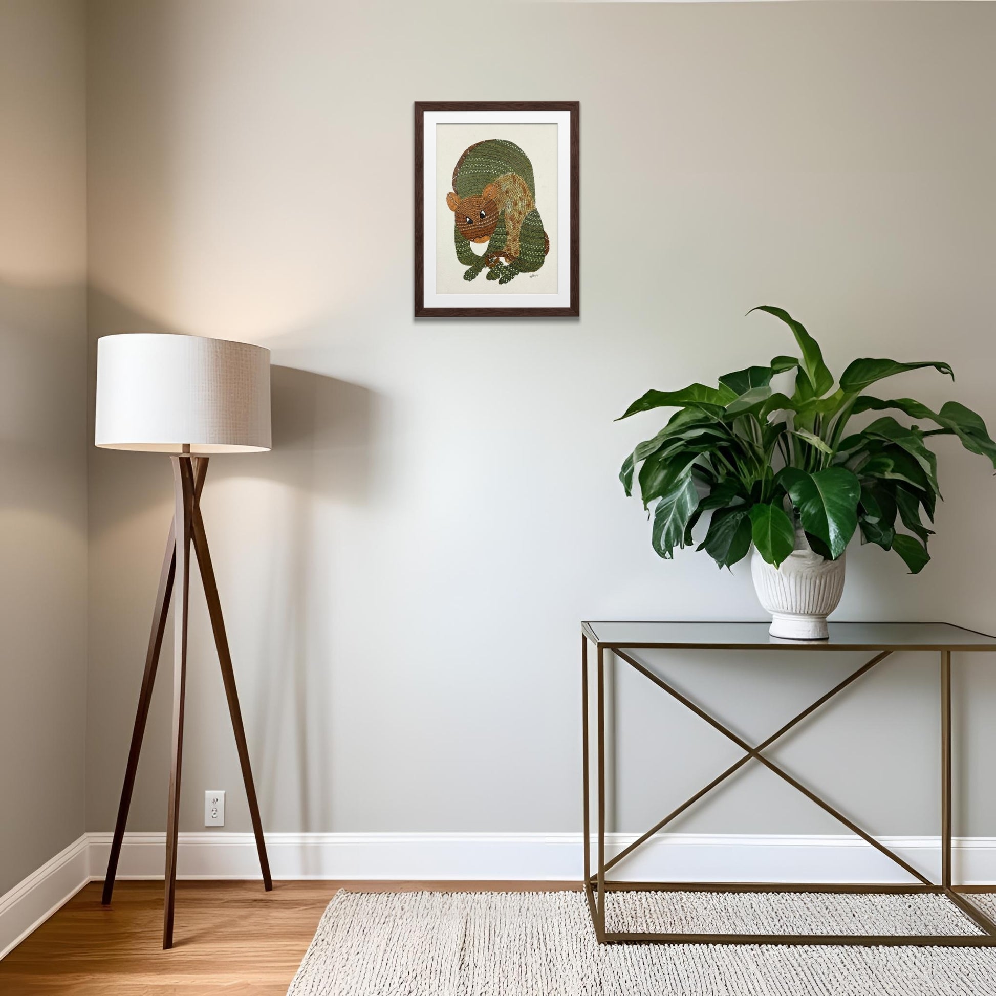 This mesmerizing Gond painting captures the essence of a squirrel in its natural, alert posture. Rendered in earthy tones of green, brown, and ochre, the artwork brings forth the meticulous detailing and intricate patterns characteristic of traditional Gond art. The squirrel, symbolizing agility and curiosity, is depicted in a moment of watchful awareness, embodying the deep connection between animals and their surroundings. The rhythmic patterns and delicate strokes add depth and movement to the piece, making it a striking representation of nature's harmony and wisdom. A tribute to the spirit of wildlife, this artwork serves as a reminder of the beauty hidden in everyday moments.